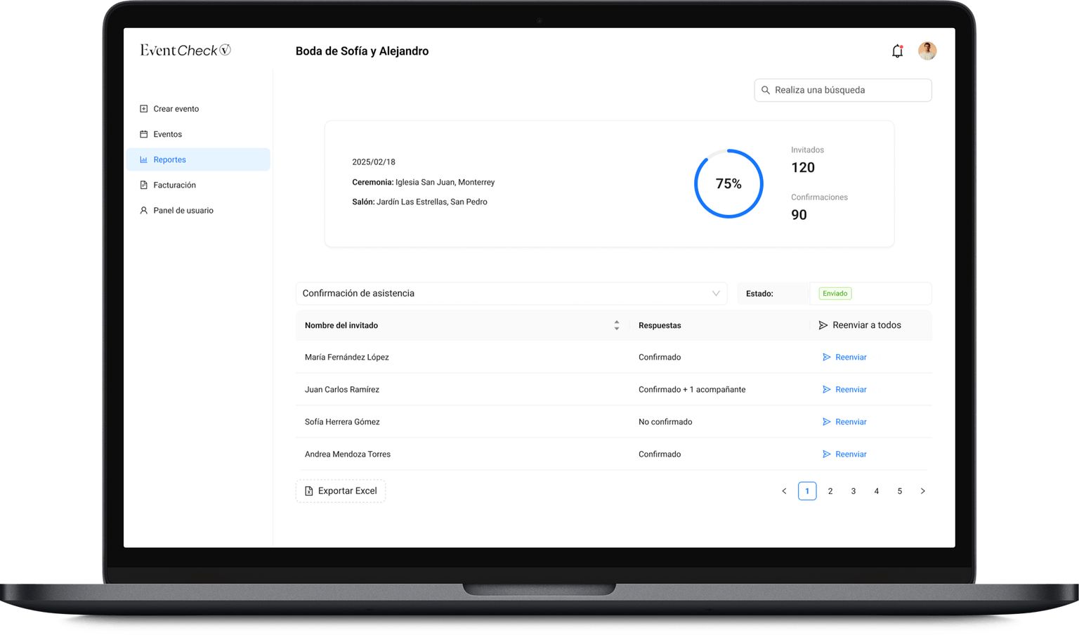 Gestiona invitaciones, confirma asistentes y realiza check-ins a través de WhatsApp, todo desde una sola plataforma.